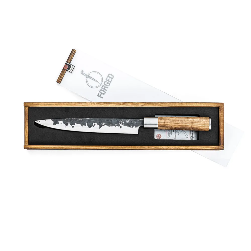 The Forged VG10 carving knife has a long, narrow blade, which ensures less resistance when cutting meat or fish and also less sticking to the blade. Highly suitable for tranching. Unlike most Forged series, the Forged VG10 knives are manufactured out of Japanese VG10 Steel with a hardness level of 60 Rockwell. All Forged VG10 knives are forged by hand in 5 layers, have a blade thickness of 2 mm and an 18-degree cutting angle. In a luxury box. We provide a 10-year warranty.